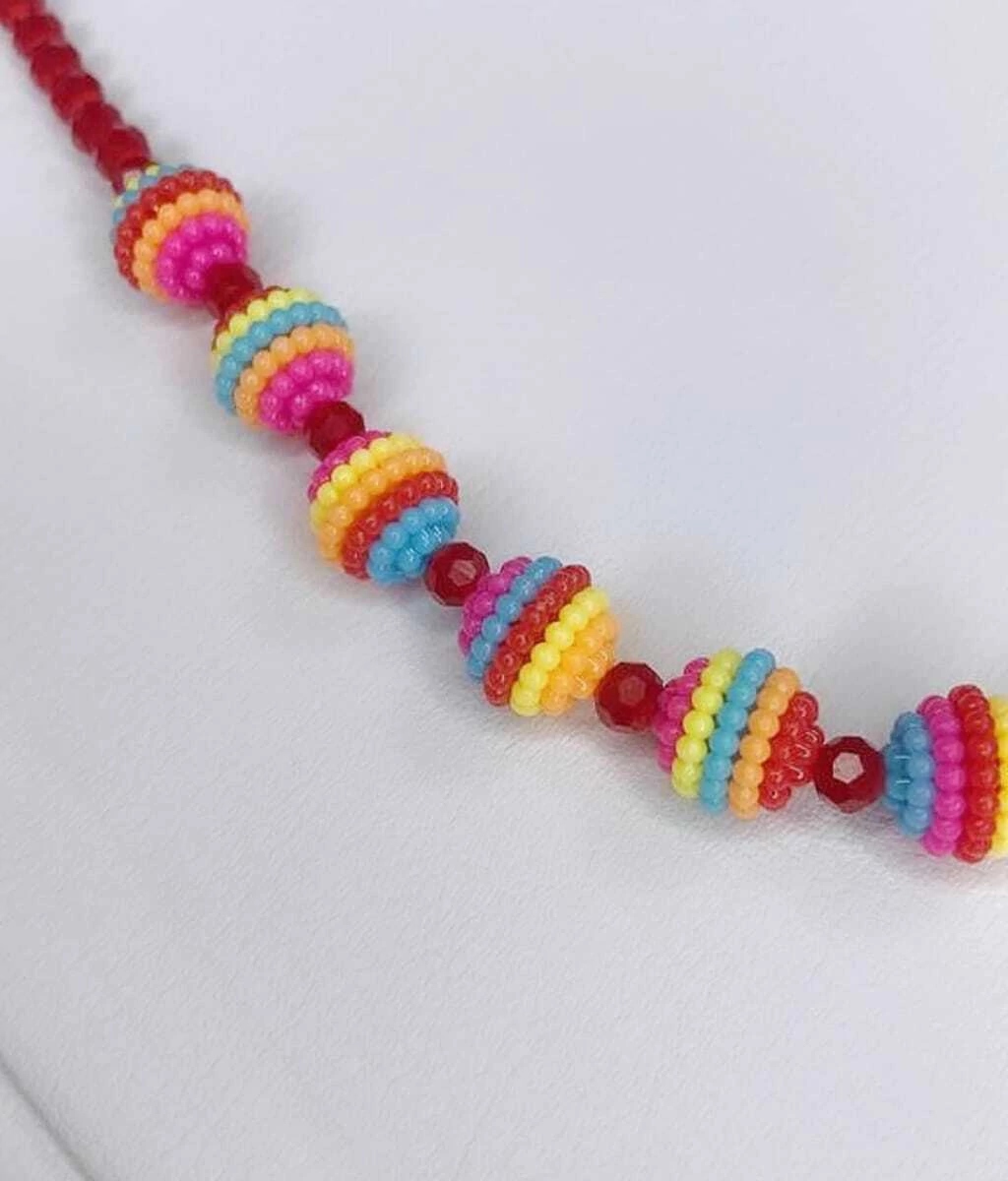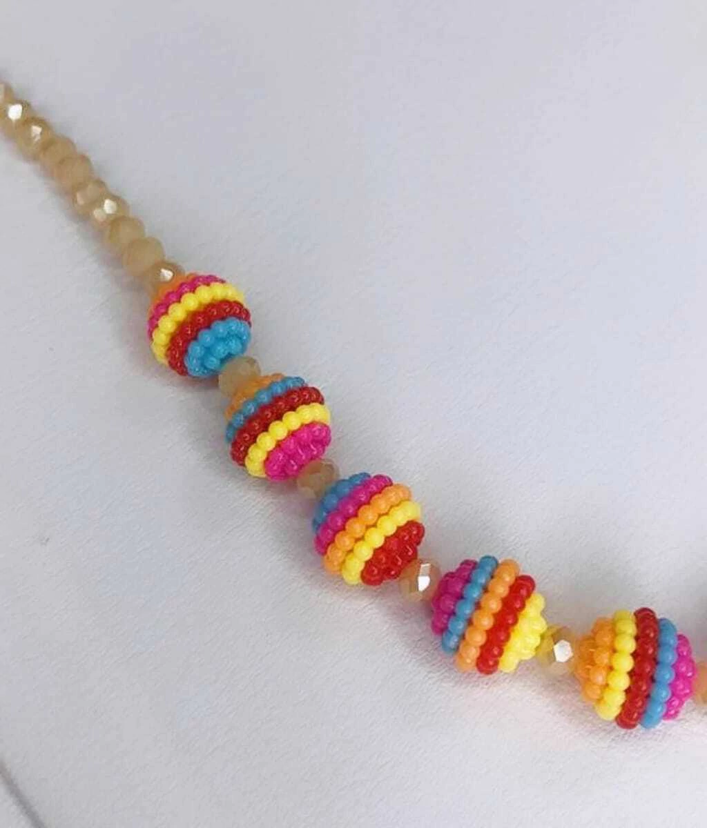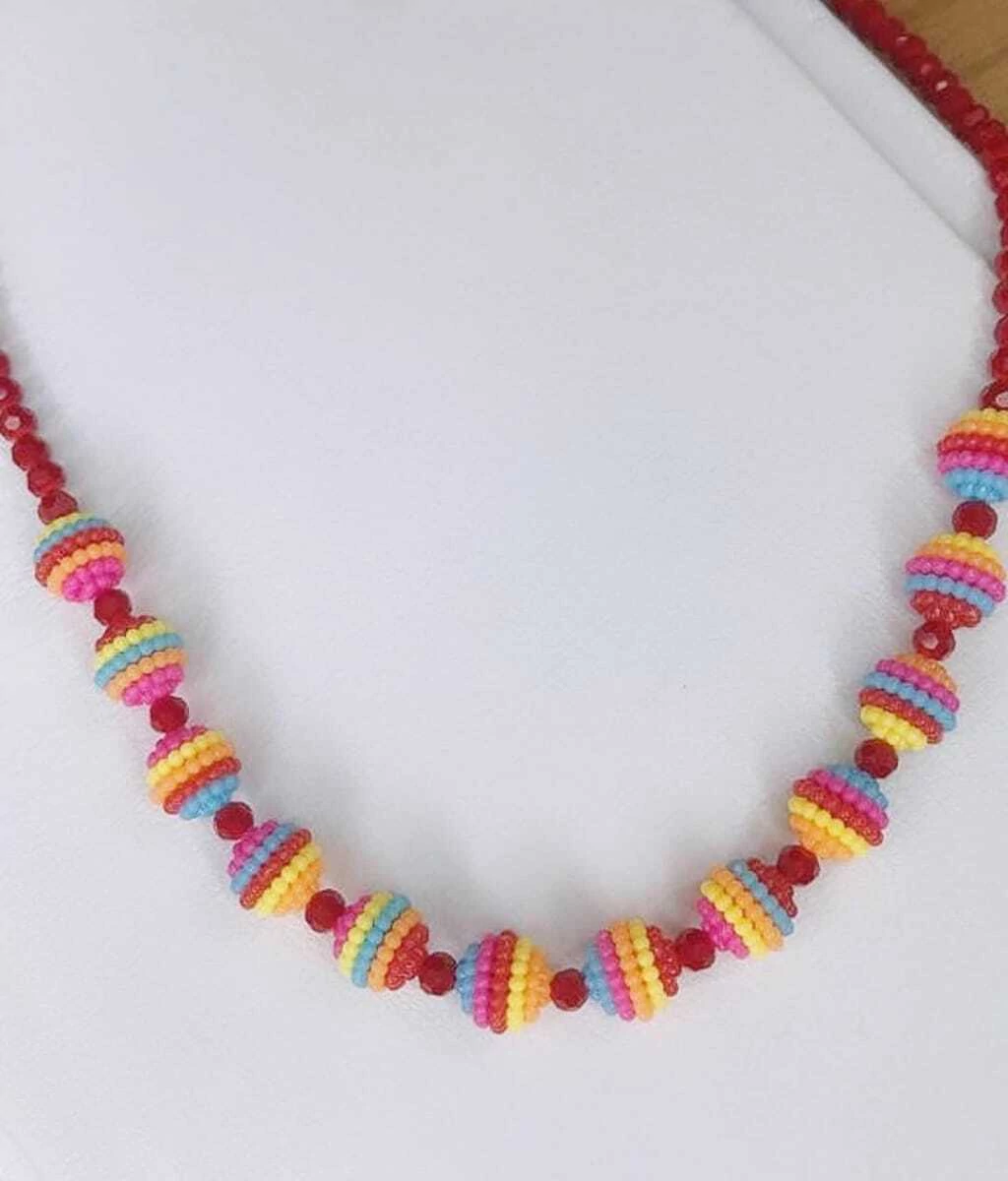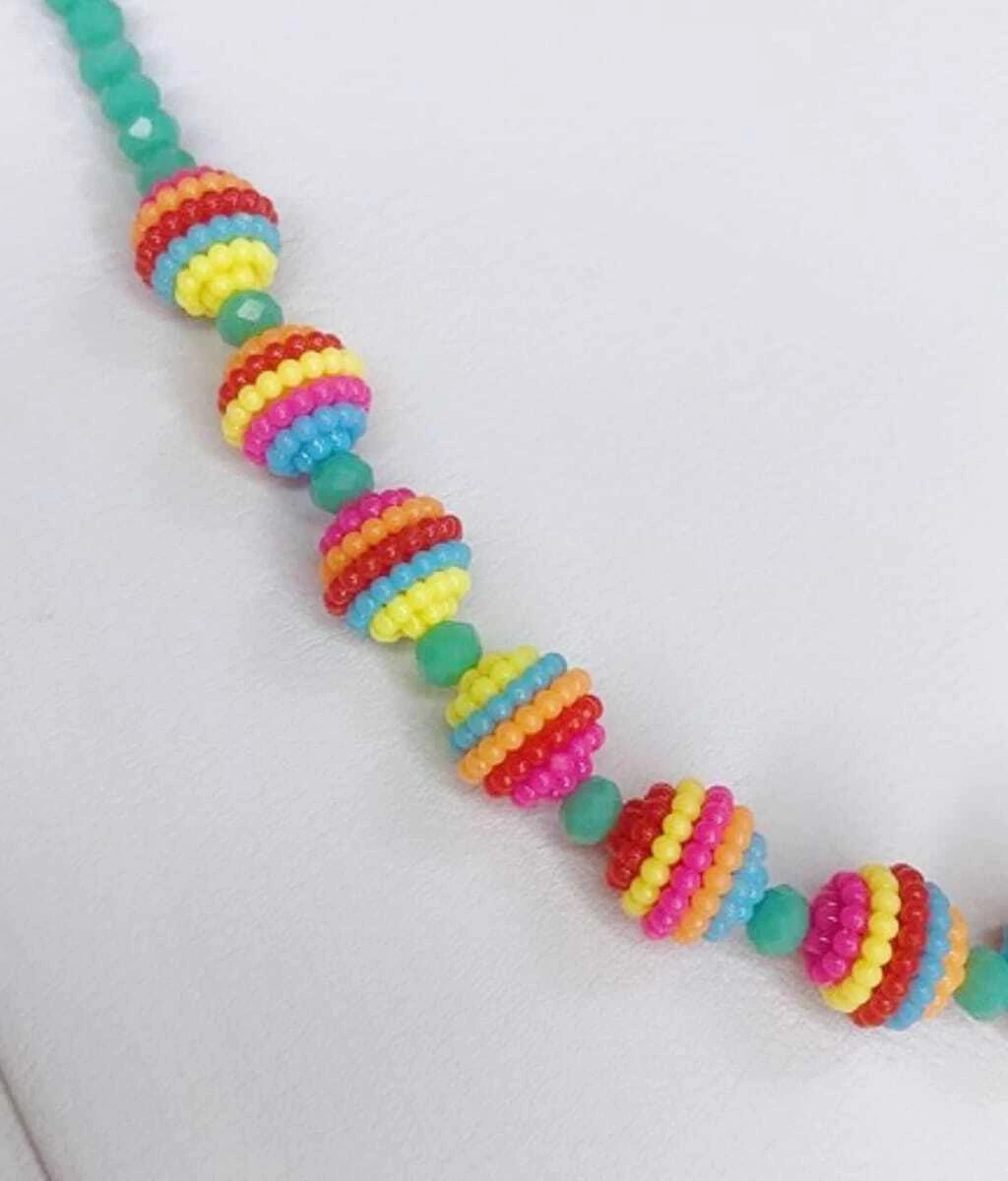A Chocker é composto por fio de nilon com bolinhas de cristais/miçangas coloridas. Possui também separadores de redondos trabalhados com pequenas bolinhas coloridas.