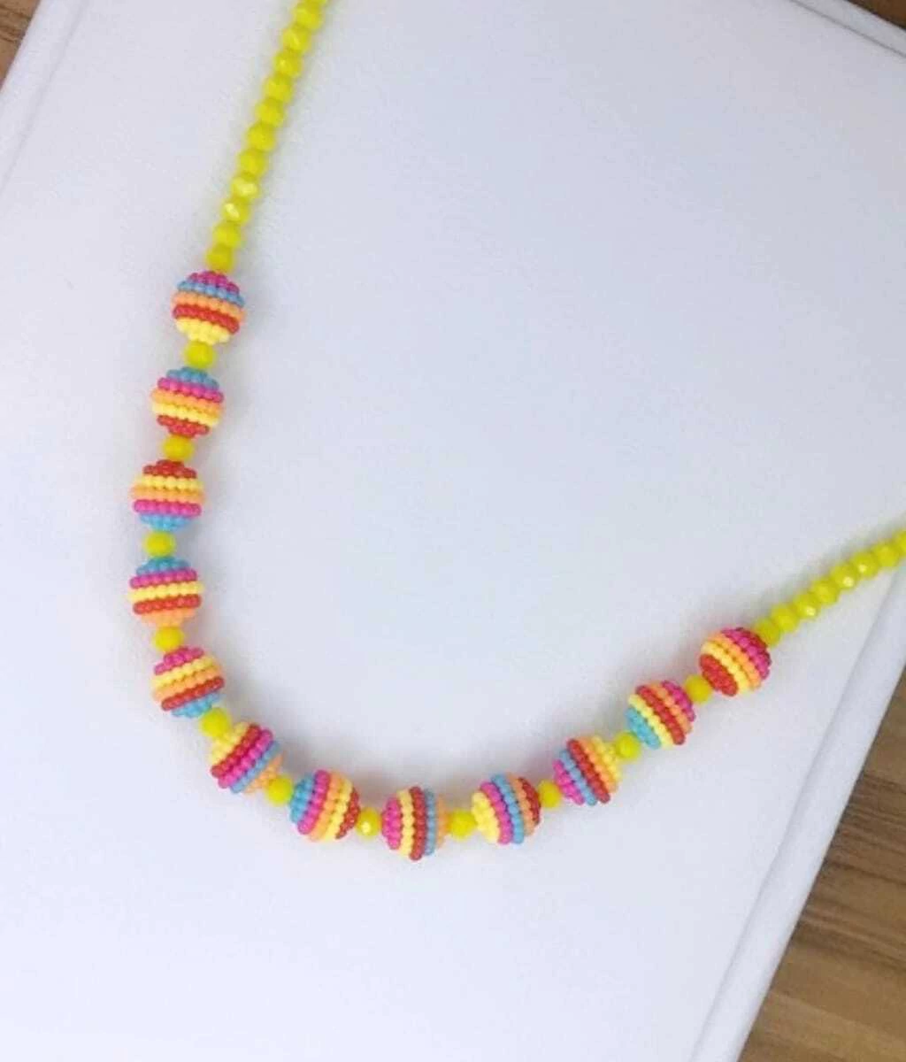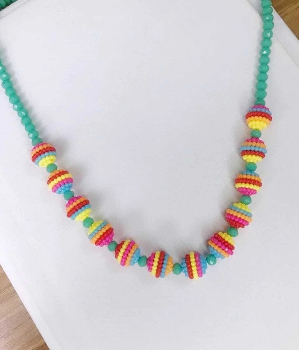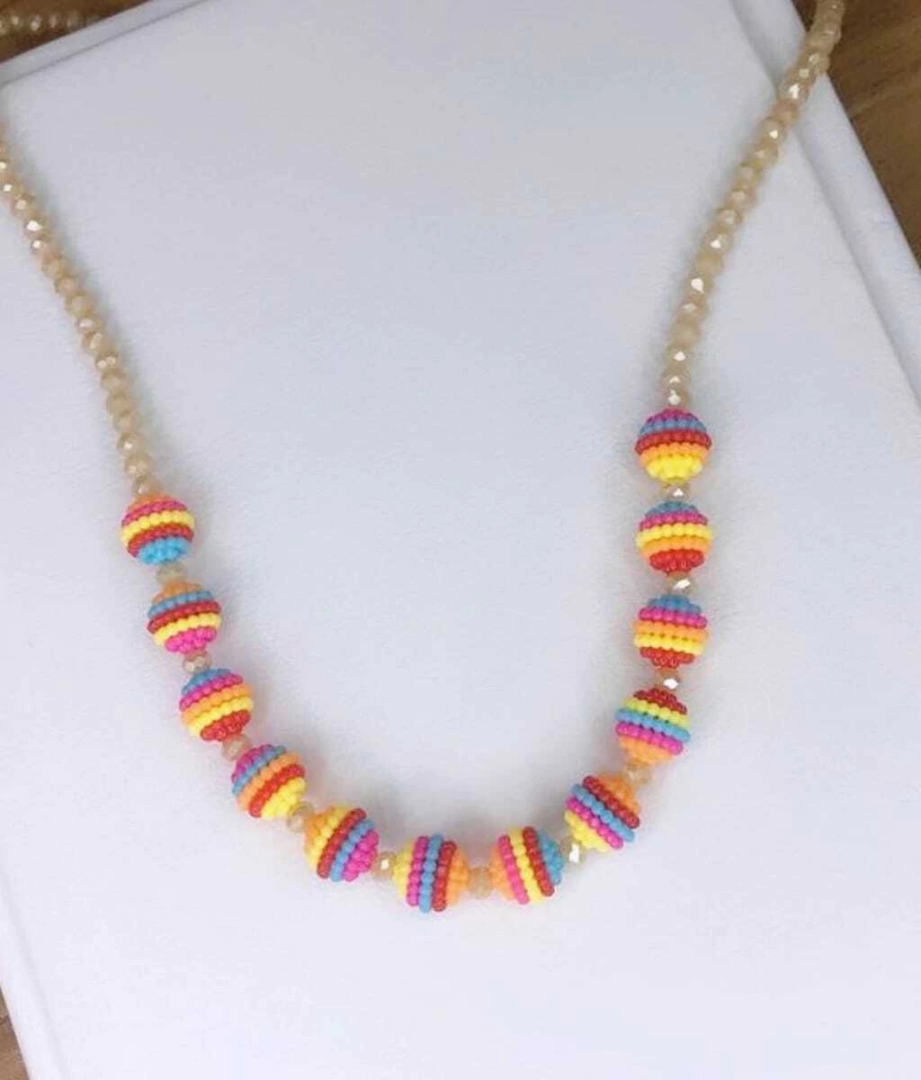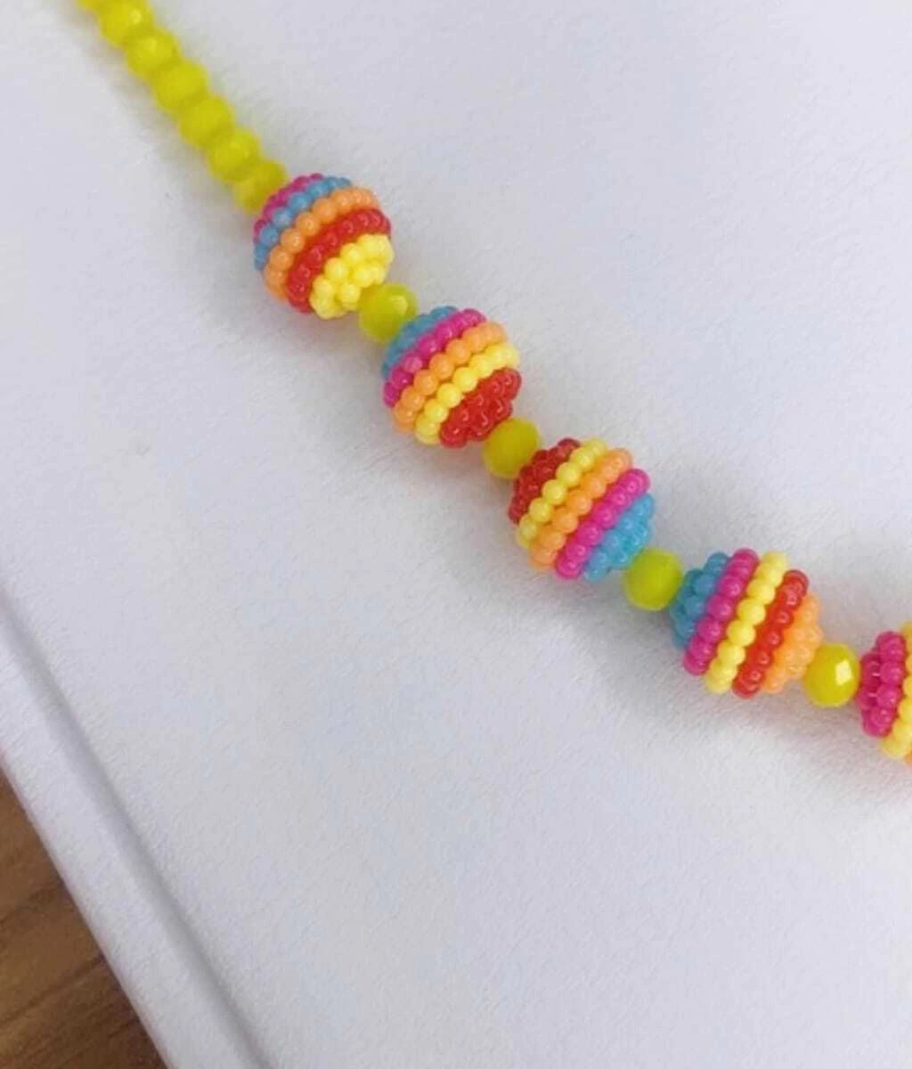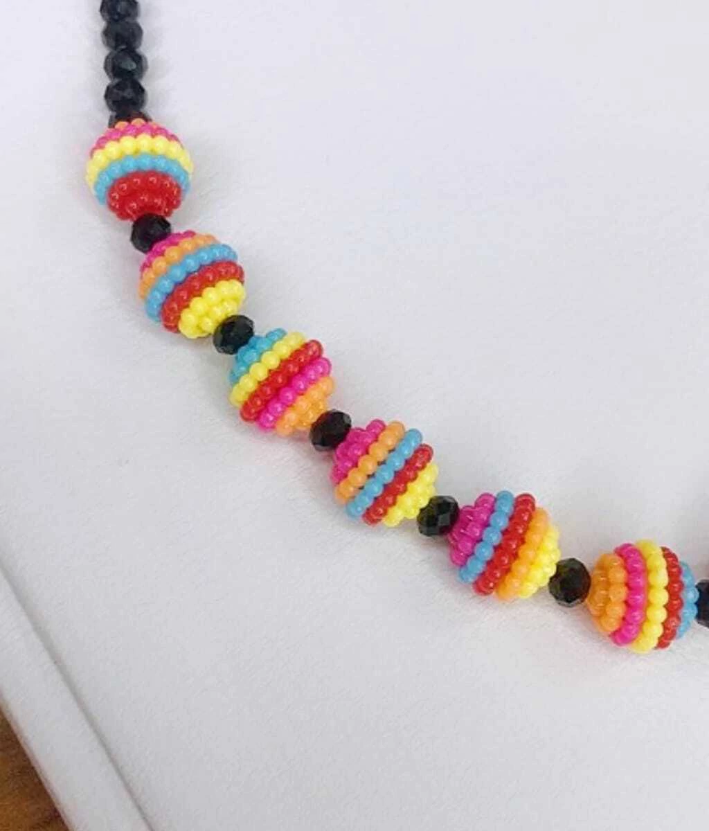 A Chocker é composto por fio de nilon com bolinhas de cristais/miçangas coloridas. Possui também separadores de redondos trabalhados com pequenas bolinhas coloridas.