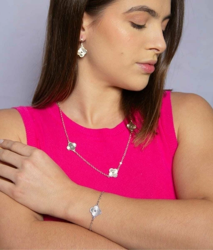 O colar é composto por pingentes inspirados no trevo de quatro folhas trabalhados, fecho lagosta, banho diamante mais dupla camada de verniz.
