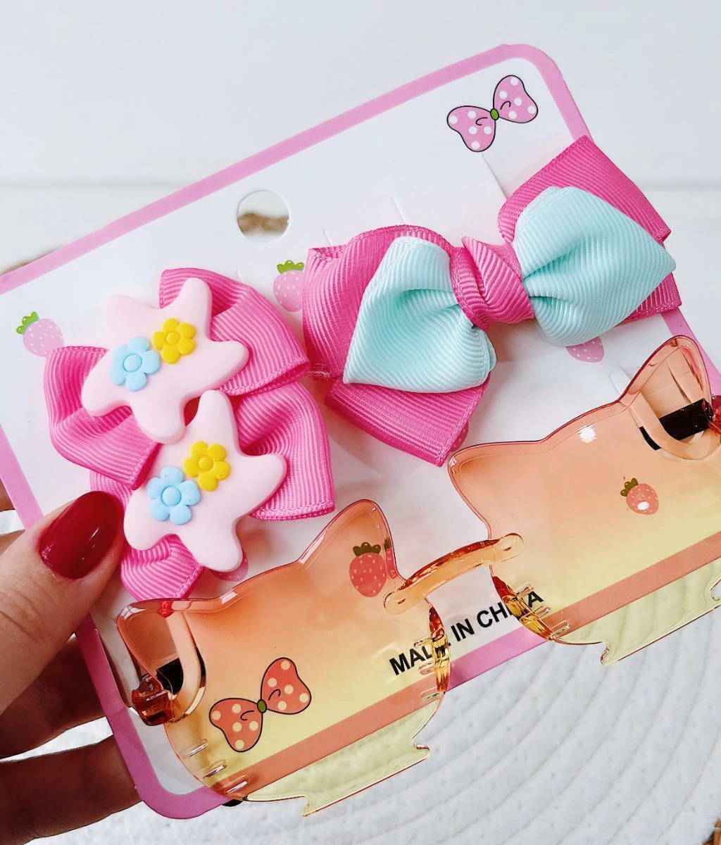 DESCRIÇÃO: O Kit Infantil é perfeito para as pequenas que adoram estilo e praticidade! Contém 1 óculos divertido, 2 pares de bico de pato com laço pequeno e 1 laço médio bico de pato, garantindo looks encantadores para o dia a dia.