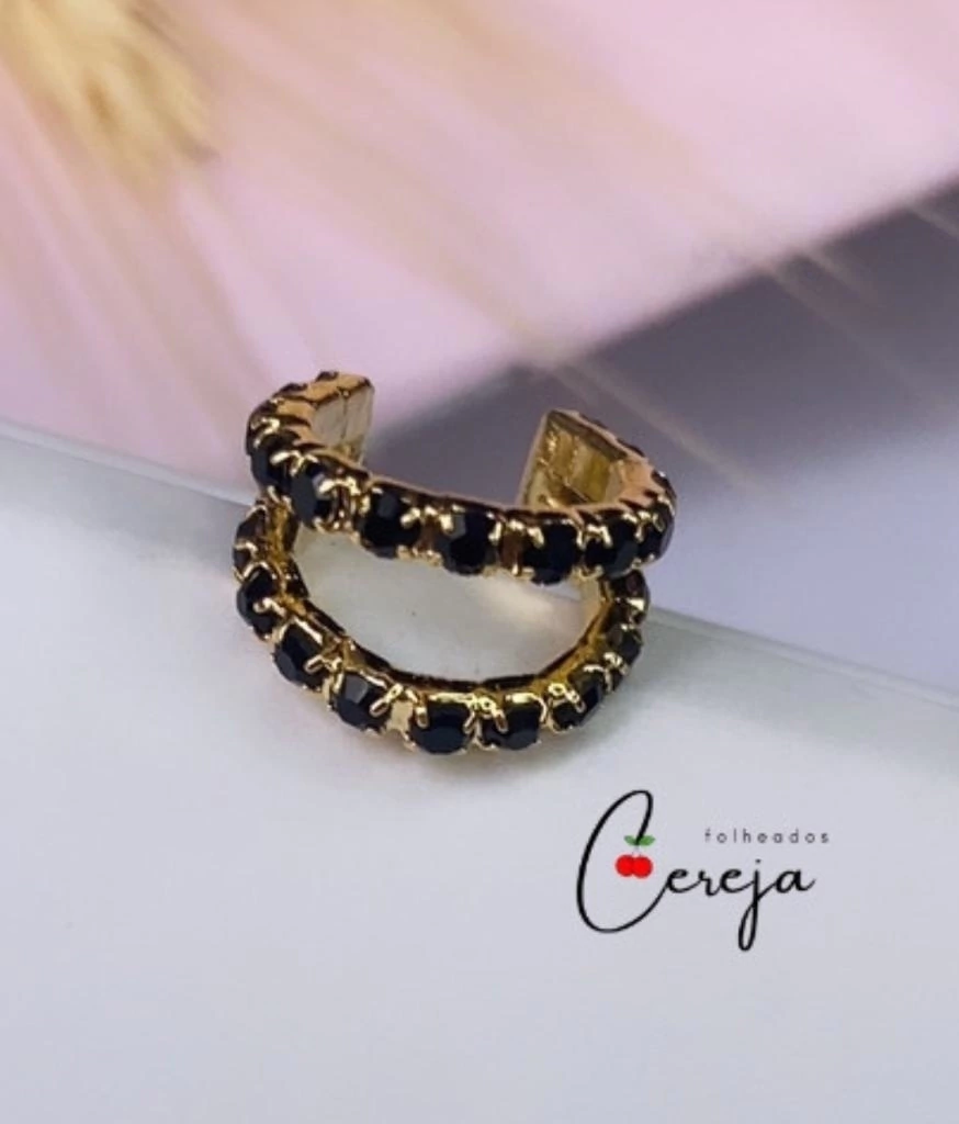 O piercing fake duplo é composto por mini pedras de strass, folheado a ouro 18k mais dupla camada de verniz.